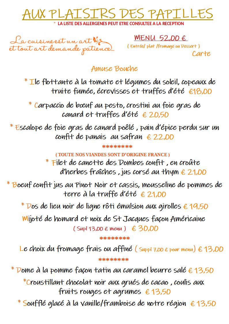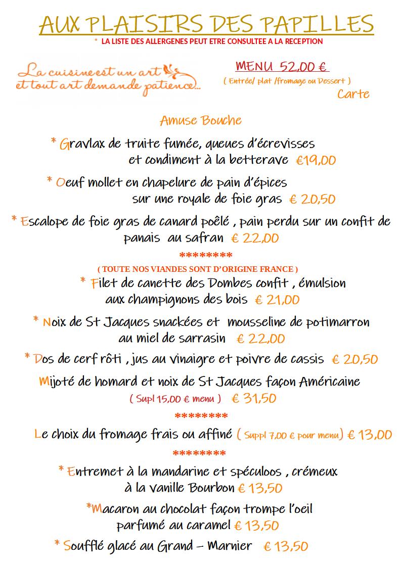 Le restaurant propose des mets du terroir et de saison. Nous nous efforçons de sélectionner des ingrédients locaux et de saison pour offrir à nos clients une expérience culinaire authentique. Notre menu est régulièrement mis à jour pour refléter les produits disponibles en fonction des saisons. Nous espérons que vous apprécierez notre cuisine du terroir et de saison lors de votre visite !